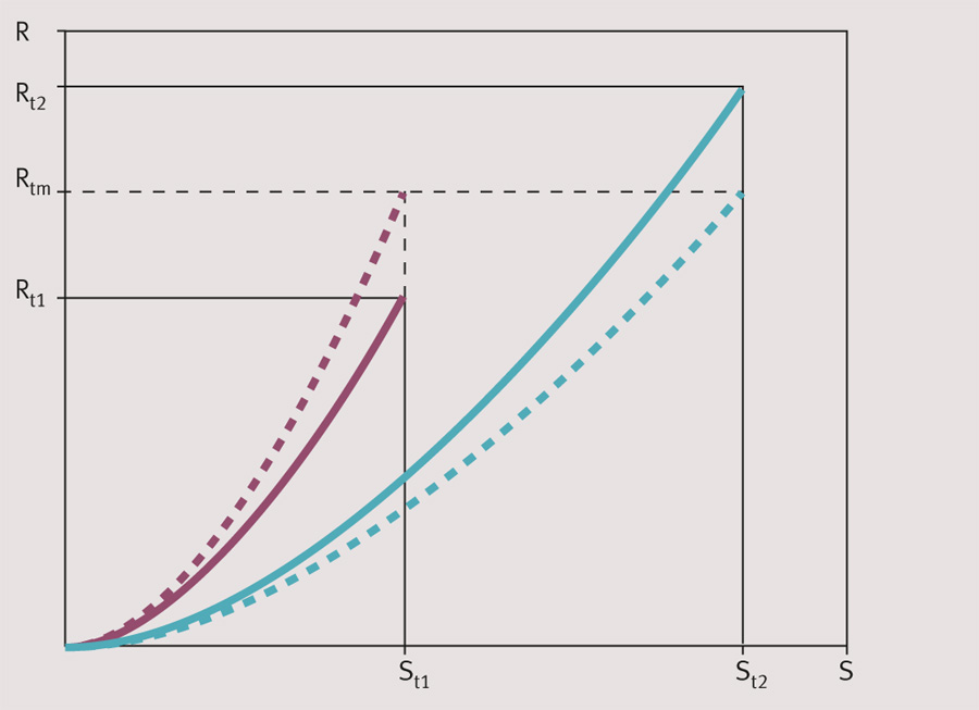 Att utarbeta en interindividuellt giltig kvotskala som också är nivåförankrad ansågs omöjligt: »Det kan ju inte finnas en giltig enhet. Det är själens obotliga ensamhet«, menade Stockholmsprofessorn Ekman. Ett förslag på lösning av detta »olösliga problem« var rangemodellen (från 1961 och 1962) med en schematiserad föreställning som enhet [5]. En upplevelse av extrem ansträngning av maximalkaraktär, som de flesta kan enas om, är känslan av att lyfta något som är så tungt att man nätt och jämt klarar av det. Om den är lika för olika individer med olika muskelstyrka så kan den subjektiva variationen sättas lika trots att den objektiva inte är lika. Ett barn som tycker att en sten är dubbelt så tung som en annan får kanske medhåll av sin far. Men om barnet säger att den stora stenen är mycket tung, säger kanske pappan att den bara är ganska tung. Rangemodellen ger då möjlighet att justera måttkonstanten och rita in två individers S–R-funktioner i samma diagram (Figur 1). Tyvärr finns nog inte någon liknande enkel referensnivå av intersubjektiv giltighet för smärta, smak, illamående eller ångest.