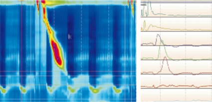 Sedan några år tillbaka har högupplösningsmanometri med Manoscanteknik [12] revolutionerat diagnostiken av hiatushernia med tryckmätning. Trycken kan översättas till färgkoder som återger ett spektrum från rött (> 60 mm Hg) till mörkblått (<0 mm Hg). Figur 2 återger normal sväljningsmanometri och Figur 3 sväljningsmanometri hos en patient med hiatushernia.