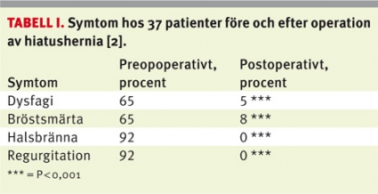Från att varit en mycket vanlig och framgångsrik behandlingsmetod vid refluxsjukdom på 1980- och 1990-talen har herniakirurgi med fundoplikation och crusplastik blivit allt ovanligare på 2000-talet. Den viktigaste orsaken härtill är förmodligen lanseringen av olika protonpumpshämmare under 1990-talet. Medicineringen har nästan lika stor effekt på refluxbesvären som kirurgi. Eftersom herniasjukdomen i regel betraktats som en refluxsjukdom kom PPI i de flesta fall att ersätta antirefluxkirurgi. De minst lika invalidiserande mekaniska herniabesvären (bröstsmärta, felsväljning med bronkitbesvär och dysfagi), som inte påverkas av PPI, har tenderat att komma i skymundan trots att de framgångsrikt kan lindras av herniakirurgi (Tabell I) [2]. Denna stora patientgrupp har låg livskvalitet och går ofta missförstådda genom vården.
