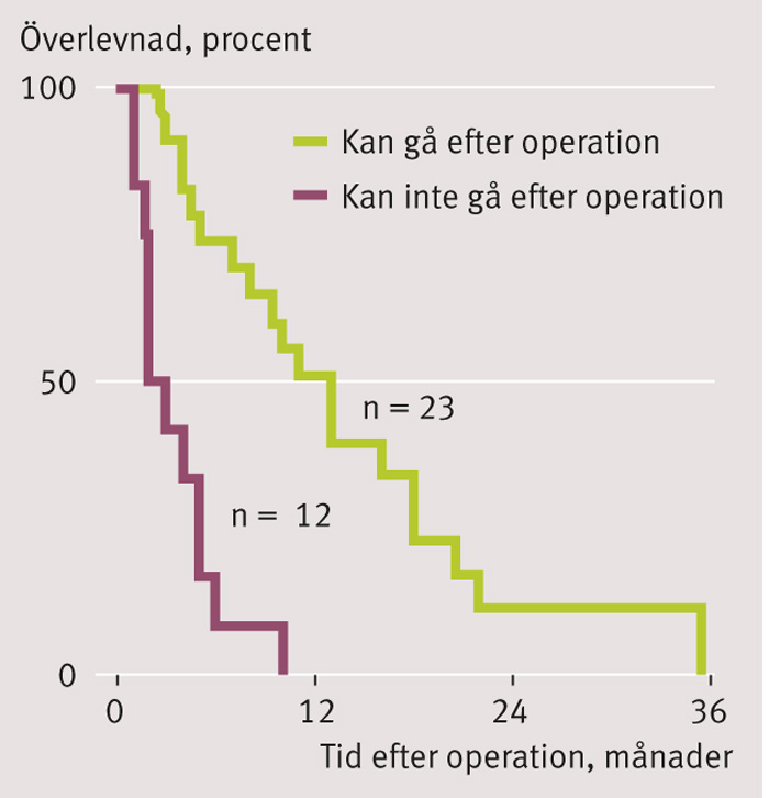 I vår studie av prostatacancerpatienter med ryggmärgskompression fann vi att bara hälften av dem som hade förlorat gångförmågan före operation kunde gå en månad efter operation, däremot behöll alla som kunde gå före operation sin gångförmåga [7, 14, 15]. Dessutom var överlevnaden bland patienter som kunde gå efter operation mycket bättre än bland patienter som förlorat gångförmågan (Figur 2) [14].