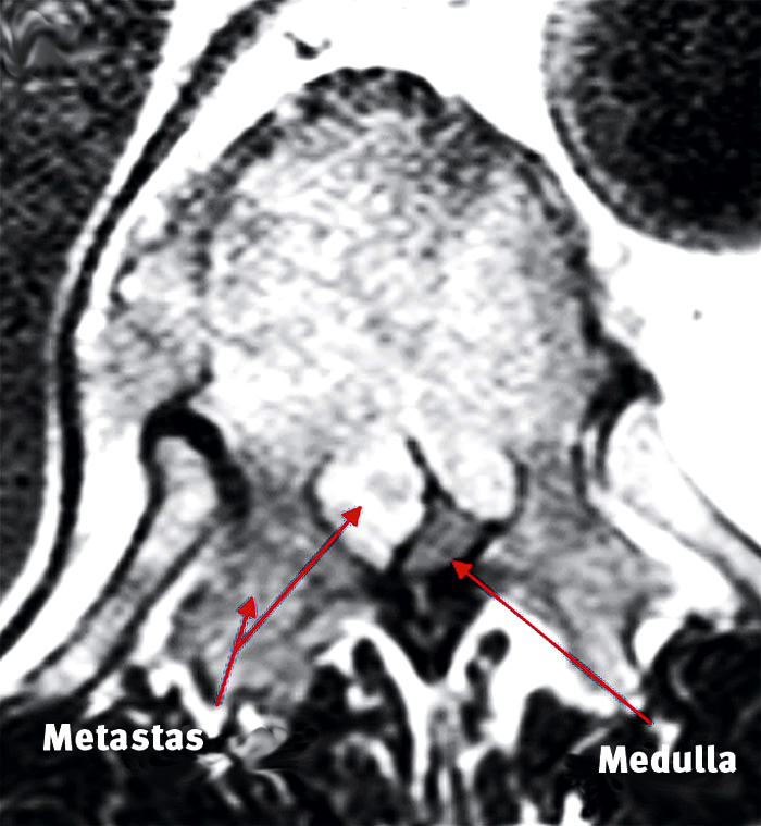 Metastatisk epidural ryggmärgskompression är en allvarlig komplikation av skelettmetastaserande tumörer och kan orsaka omfattande morbiditet inklusive paralys och påverkan på blås- och analsfinkterfunktionerna. Kompressionen uppstår antingen som följd av ett direkt tryck av en metastatisk tumörväxt eller indirekt via en destruerad eller kollapsad kota (Figur 1). Tillståndet drabbar ca 5 procent av patienterna med cancer, oftast lungcancer, prostatacancer, bröstcancer och myelom [1, 2]. Vanligtvis uppstår ryggmärgspåverkan hos patienter med kända skelettmetastaser, men ibland kan den vara den första manifestation av en tidigare okänd spridd malign sjukdom. Incidensen av metastatisk ryggmärgskompression kommer sannolikt att öka då cancerincidensen stiger på grund av en åldrande population.