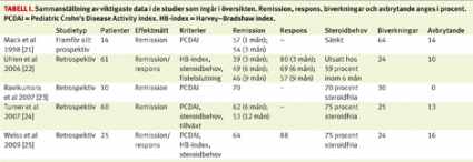 En svårighet i jämförelsen av studierna är definitionen av begreppen remission och respons. Fyra av fem studier använde PCDAI, ett i klinisk praxis sällan använt index för att bedöma sjukdomens aktivitetsgrad, med eller utan kompletterande faktorer (steroidbehov; tillväxt, HB-index). Förutom det uppenbara att effektmåtten härigenom inte helt motsvarar varandra måste man också beakta den kliniska relevansen i förbättring enligt ett index. Vi anser trots allt att jämförelsen är av värde.