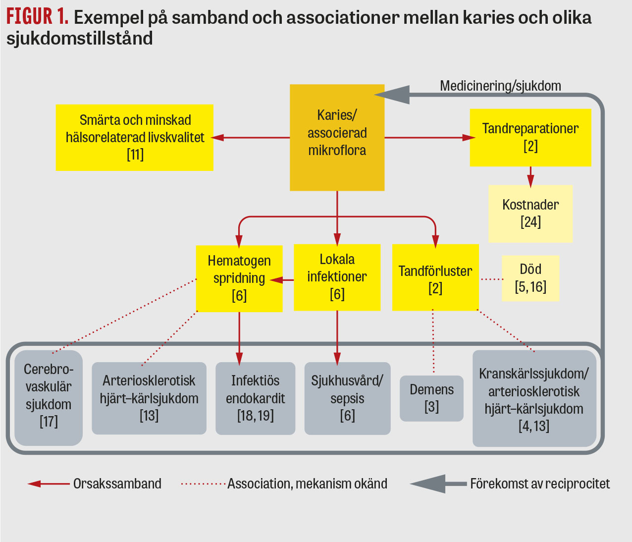 Även andra svenska och internationella studier har publicerat resultat om sambandet mellan parodontit och demenssjukdom [22-24]. I en studie av Holmer och medarbetare 2018 [22] undersöktes 154 fall i Stockholms län diagnostiserade med endera subjektiv kognitiv försämring utan objektiva fynd på kognitiv nedsättning (SCI), lindrig kognitiv funktionsnedsättning (MCI) eller Alzheimers sjukdom. Studien var en fall–kontrollstudie, och 76 kognitivt friska ålders- och könsmatchade kontroller bosatta i Huddinge kommun undersöktes också. Alla deltagare genomgick en klinisk och röntgenologisk undersökning. På röntgen undersöktes alveolär benförlust som ett mått på ackumulerad historisk benförlust under livet, det vill säga hur mycket parodontit som deltagarna har och hade haft. De deltagare som hade någon form av kognitiv försämring visade sig också ha en mer generell alveolär benförlust, ökat antal djupa tandköttsfickor och även tandkaries. Resultaten är intressanta; den relativt begränsade urvalsstorleken samt fall–kontroll-upplägget räcker inte för att stödja ett orsakssamband, men visar stöd för ett samband mellan parodontit och kognitiv dysfunktion som behöver undersökas ytterligare.