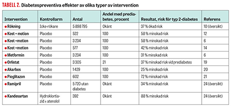 Det kan noteras att inget läkemedel i Sverige har prediabetes som godkänd indikation. Det vore också intressant att veta om livsstilsåtgärder och farmakologisk intervention potentierar varandras diabetespreventiva effekt. Nedan nämns ett urval av studier [17, 18].