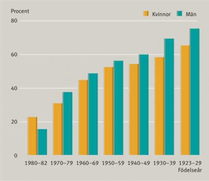 Cigarettrökning har blivit allmänt förekommande i Sverige under 1900-talet. Under detta sekels första decennier spred sig rökningen bland männen, men det var fortfarande ovanligt att kvinnor rökte. Vid studier av ålderskohorter i den svenska befolkningen finner man att bland kvinnor födda på 1920- och 1930-talen är andelen individer som någonsin rökt mycket låg. Det var först fyrtiotalisterna, som i detta avseende blev jämställda med männen. Bland kvinnor födda under 1940-talet är andelen kvinnor som någonsin rökt lika stor som hos männen, och i senare kohorter är andelen rökande kvinnor större än hos männen. I en ännu opublicerad populationsstudie i sydvästra Skåne år 2000 har mer än 9000 slumpvis utvalda individer i åldrarna 18–77 år besvarat ett frågeformulär. Man finner att 27 procent av kvinnorna är aktiva rökare och att totalt 55 procent någonsin har rökt. Bland männen är motsvarande siffror 24 respektive 57 procent. Bland äldre män finner man (Figur 1) en väsentligt större andel någonsin-rökare, medan bland yngre kvinnor födda på 1940-talet och senare är andelen kvinnor som någonsin rökt lika stor eller större än bland männen [Peter Montnémery, Lund, pers medd; 2006]. Andelen som lyckats sluta röka i ovanstående populationsstudie är lägre bland kvinnorna i alla åldrar (Figur 2). En möjlig förklaring till detta är att det verkar vara svårare för kvinnor att sluta röka. Lyckat rökslut är ovanligare bland kvinnor såväl i studier av spontant rökslut [1, 2] som i studier med aktiv rökavvänjning, t ex den stora amerikanska »Lung HealthSstudy« som gjorts på patienter med lindrig KOL. I den senare studien såg man att framförallt sena återfall ökade bland kvinnor [3]. En tänkbar förklaring till detta kan vara att nikotinberoendet blir mera uttalat hos kvinnor, vilket vissa andra studier gör gällande [4]. KOL är vanligast i högre åldrar, men kvinnors tidiga rökdebut medför risk för KOL-insjuknande redan vid 40 års ålder. Kvinnor föder barn allt senare i livet, vilket betyder att även småbarnsmammor kan insjukna i KOL.
