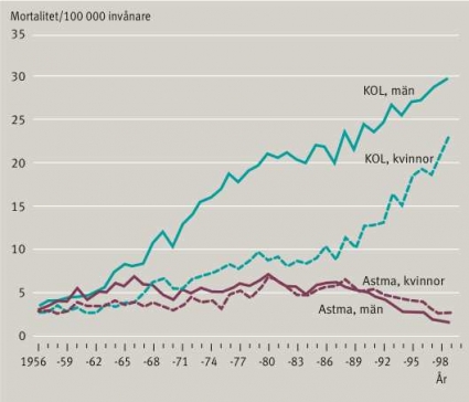 För några år sedan gjordes en studie av de samhällsekonomiska konsekvenserna av KOL och astma, med jämförelser av registerdata från 1980-talet och framåt [5]. Från denna studie visar mortalitetsdata enligt Figur 3 att redan under 1950- och 1960-talen skedde en ökning av mortalitet i KOL jämfört med astma. År 1970 var mortaliten i KOL 2–3 gånger större än i astma för män, och efter detta har mortalitenen skjutit i höjden, med minst tio gånger högre mortalitet i KOL än i astma för män under slutet av 1990-talet [5]. För kvinnor har mortaliteten i KOL ökat långsammare. Under den första delen av 1990-talet registrerades 2–3 gånger högre mortalitet än i astma, men under sista delen av 1990-talet har en påtaglig ökning skett bland kvinnor. År 2003 var total mortalitet i kroniska nedre luftvägssjukdomar utom astma 1216 bland kvinnor och 1392 bland män (data från Socialstyrelsens register). »KOL-epidemin« bland kvinnor är alltså fortfarande i en ökningsfas.