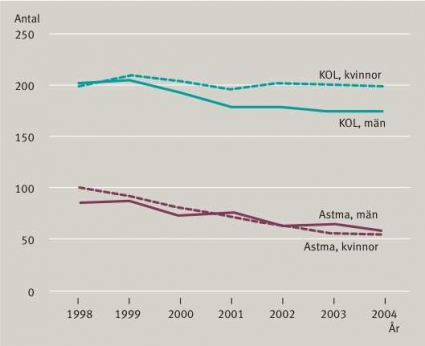 Internationellt är mönstret likartat, och i USA har det under åren 1982–1996 skett en ökning av såväl kronisk bronkit som emfysem [6]. Denna ökning är väsentligt större för kvinnor än för män. Emfysem bland män har till och med minskat i förekomst under denna tid. I Storbritannien har under 1990-talet prevalensen av KOL ökat med 25 procent bland män,och med ca 70 procent bland kvinnor. En ökning föreligger också i den icke industrialiserade delen av världen, även om männen där dominerar. I många länder i Asien förekommer KOL emellertid även hos icke-rökande kvinnor som en följd av de eldstäder utan skorsten som är vanliga där. Prognoser visar att såväl globalt som nationellt kommer det att ske en ökning av KOL-prevalensen under de närmaste åren. Även om det uppnås utopiskt goda resultat av rökslut kommer under de närmaste 10–15 åren prevalensen ändå troligen att öka, och då främst hos kvinnor. Vid registrering av vårdtillfällen i en svensk studie under senare år visades att KOL som huvuddiagnos blivit allt vanligare hos kvinnor än hos män [5]. Under 1990-talet gick kvinnorna i kapp männen i antal vårdtillfällen på grund av KOL (Figur 4). Under 2000-talet har antalet vårdtillfällen varit konstant för kvinnor men minskat för män. Ökningen i antal vårdtillfällen bland kvinnor kan bero på en ökande prevalens, men en annan förklaring kan vara en ökad känslighet för rökens toxiska effekter och därmed en svårare sjukdom hos kvinnorna.