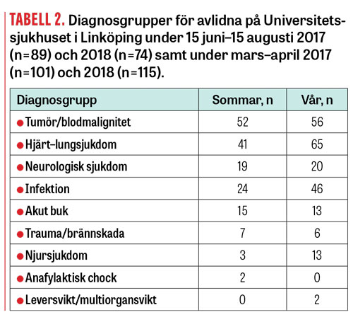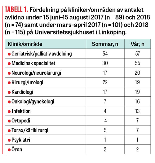 En strukturerad granskning av journalerna gjordes för samtliga patienter som avlidit under sommarperioden (15 juni–15 augusti) 2017 och 2018. Som jämförelse valdes en lika lång period under våren (mars–april 2017 och 2018), som är representativ för normal verksamhet enligt vårdstatistik för Universtitetssjukhuset i Linköping. Enligt statistik från Vårddatalagret för Region Östergötland varierade inte mortaliteten i befolkningen signifikant under 2015–2018.