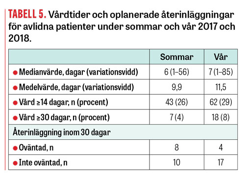 Oplanerade återinläggningar inom 30 dagar skedde hos 18 patienter under sommaren, varav 10 bedömdes som oväntade och 8 som inte oväntade (oftast avancerad tumörsjukdom). Under mars–april förekom 21 återinläggningar, varav 4 oväntade och 17 inte oväntade.