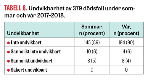 Sannolikt undvikbara dödsfall bedömdes förekomma hos 5 procent under sommaren och 4 procent under våren (Tabell 6). Inget dödsfall bedömdes vara säkert undvikbart.