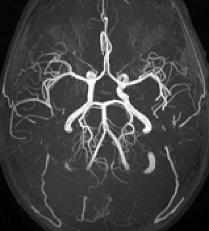MR-angiografi. Med MR-angiografi kan man avbilda blodkärl utan kontrastinjektion eller efter intravenös kontrastinjektion. Den ovannämnda bättre undertryckningen av bakgrunden i bilden, kombinerad med ökat signal-till-brus konkurrerar med viss saturation av blod till följd av något ökad T1, men ger sammantaget bättre avbildning av små perifera kärlgrenar vid inflödes-MR-angiografi utan kontrastinjektion vid 3T [5-7] (Figur 2). Flera parametrar kan kombineras för att erhålla optimal effekt vid 3T-MR-angiografi, exempelvis kan ökat signal-till-brus användas för förbättrad upplösning, och bättre bakgrundsundertryckning kan användas för att sänka flipvinkeln i angiografisekvenser, vilket motverkar saturering av blod som flödar i bildplanet. Kombination med »magnetization transfer contrast«-teknik kan dessutom ytterligare förbättra bakgrundsundertryckningen [8]. Det är således fördelaktigt att använda en 3T-utrustning för intrakraniell MR-angiografi. Man ska dock vara medveten om att en lätt »förträngning« av arteria carotis interna vid skallbasen ibland kan ses på grund av en susceptibilitetsartefakt vid hög fältstyrka.