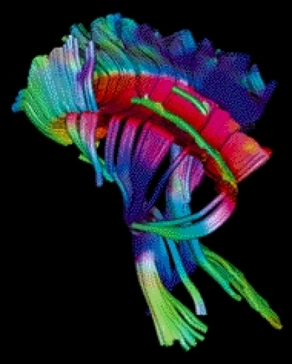 Trots susceptibilitetsartefakter vid skallbasen kan hjärnstammen och lillhjärnan vanligen bedömas adekvat på högfälts-, diffusions- och perfusions-MR. »Parallel imaging«-teknik med flerkanaliga mottagarspolar kan avsevärt reducera dessa susceptibilitetsartefakter. Den höga fältstyrkan medger möjligheter att använda ett stort antal olika riktningar vid diffusionsundersökning med »diffusions-tensoravbildning« med rimlig tidsåtgång för kliniskt bruk. Detta är en relativt ny diffusionsapplikation som medger avbildning och bedömning av banorna i vit substans i hjärnan [9]. Man kan dels detektera patologi i vit substans tidigare än med andra MR-sekvenser, dels avbilda banorna i hjärnan med avseende på riktning, dislokation, avbrott och infiltration. Den sistnämnda tekniken kallas diffusions-tensortraktografi (Figur 3).