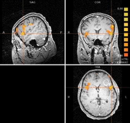 Funktionell MR (fMRI). fMRI kan helt icke-invasivt påvisa aktivering i hjärnbarken vid motorisk aktivitet, tex vid fingerrörelse eller vid sensorisk stimulering. Man kan även påvisa aktivitet då patienten/försökspersonen tänker på ord, vilket kan lokalisera språkcentrum. Metoden används också mycket för kognitiva studier. Preoperativ fMRI med bildtagning som täcker hela hjärnan kan användas för att kartlägga lokalisationen av viktiga funktioner i hjärnbarken hos patienter med hjärntumörer och andra lesioner, vilket är till nytta för den preoperativa planeringen (Figur 4). Den ökade känsligheten för signalskillnader vid aktivering jämfört med vila vid höga fältstyrkor, orsakad av blodflödesförändringar med ändrad halt av deoxihemoglobin, ger mer tillförlitlig lokalisation av hjärnfunktion och kortare undersökningstider [10].