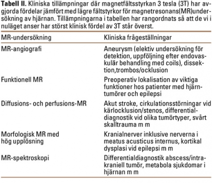 Klinisk 3T-MR av hjärnan har fördelar för högupplösande morfologisk bildtagning, men framför allt för MR-angiografi, diffusions- och perfusions-MR, funktionell MR (fMRI) och MR-spektroskopi. Fördelar och nackdelar jämfört med lägre fältstyrkor är sammanfattade i Tabell I och Tabell II.