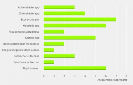 Under det senaste året har vi sett en ökande förekomst av MRSA (meticillinresistenta Staph aureus) i svensk hälso- och sjukvård. Inom svensk intensivvård är problemen fortfarande relativt begränsade. Sammanställningar från IVA-STRAMA (Fakta1) från åren 2001–2003 visar att antibiotikaval vid empirisk behandling av infektioner med Staph aureus och Efaecalis är relativt okomplicerat, medan valmöjligheten vid infektion med E faecium är begränsad till vankomycin och linezolid (Figur 2).