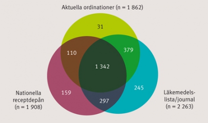 Av de inbjudna patienterna gav 274 av 294 tillfrågade skriftligt informerat samtycke till deltagande. 29 av dessa kunde inte intervjuas, och 22 uppfyllde inte inklusionskriteriet ≥5 ordinationer i läkemedelslistan. Materialet består därför av 223 patienter (82 procent av dem som uppfyllde inklusionskriterierna), 116 kvinnor och 107 män, med sammanlagt 2 563 ordinationer/recept (median 10; variationsvidd 5–31). Överensstämmelsen med avseende på unika aktuella ordinationer mellan de tre informationskällorna var 52,4 procent (Figur 1).