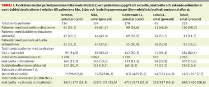 Klassificeringen i studien ger emellertid en underskattning av avvikelserna mellan läkemedelslistan respektive receptlistan och patientens aktuella medicinering. Klassificeringen »dubblett« har använts för identiska, aktuella ordinationer (samma aktiva substans, beredningsform, styrka och dosering) men inte för ordinationer med samma aktiva substans och beredningsform med olika dosering. I 30 procent av dessa fall har patienterna uppgett att båda är aktuella ordinationer. Materialet innehåller också ordinationer av olika läkemedel men med samma användningsområde. Flera patienter har därför sannolikt dubbelmedicinering.
