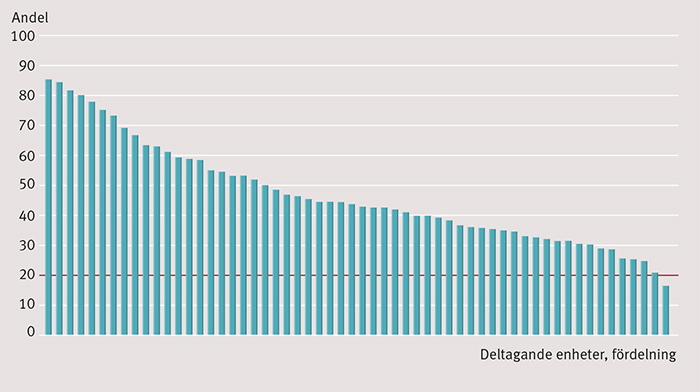 Figur 1. Akut bronkit, andel antibiotikabehandlade, fördelning deltagande enheter. Röd linje = målet <20 procent.