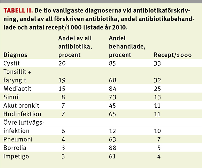 År 2010 deltog 56 vårdcentraler, varav 32 från Stockholmsområdet, med totalt 551 250 listade invånare och 865 050 läkarbesök. En infektionsdiagnos fanns registrerad vid 211 562 läkarbesök. Infektioner i luftvägar utgjorde 73 procent, i urinvägar 11,7 procent, i hud 12,5 procent, och specifika infektioner utgjorde 2,8 procent. Vid 44 procent av besöken med en infektionsdiagnos förskrevs antibiotika (Tabell I). I medeltal förskrevs 168 recept/1 000 listade invånare (i åldersgruppen 0–6 år 387 och i åldersgruppen 20–79 år 144 recept).