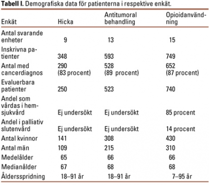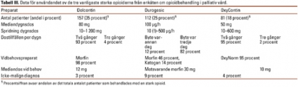 492 patienter (66 procent) behandlades med en opioid, och av dessa gavs drygt 90 procent en stark opioid. 94 procent av patienterna med en stark opioid hade en cancerdiagnos. 39 patienter med stark opioid (9 procent) hade en smärtpump. Av patienterna som hade en cancerdiagnos var det 30 procent som inte använde en opioid. Tabell III visar användandet av de tre vanligaste starka opioiderna avseende dygnsdos, doseringstillfällen och vidbehovspreparat. Totalt 350 av 452 patienter som behandlades med en stark opioid använde Dolcontin, Durogesic eller OxyContin. Övriga patienter använde en annan stark opioid. Dolcontin gavs till drygt en tredjedel av patienterna som använde en stark opioid, och fler än 90 procent av patienterna använde tvådosförfarande. Vidbehovsdosen motsvarade ungefär en sjättedel av dygnsdosen, vilket är allmänt rekommenderat. Omräknat till motsvarande dygnsdos av morfin låg medianvärdet för dygnsdosen av Durogesic betydligt högre än för dygnsdosen Dolcontin och OxyContin. Om Durogesic 25 µg/h antas motsvara 50 mg peroralt morfin låg mediandygnsdosen för Durogesic i vårt material på motsvarande 200 mg peroralt morfin.