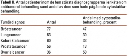 Cytostatikabehandling gavs till 182 patienter (35 procent), varav 121 kvinnor och 61 män. Medelåldern för dessa var 60 år. I 94 procent av fallen var behandlingsintentionen palliativ. 91 procent av patienterna som fick cytostatikabehandling tog sina prov via den palliativa enheten. 25 patienter (14 procent) hade understödjande behandling relaterad till cytostatikabehandlingen. 22 av dem behandlades med erytropoetinpreparat. Tabell II visar antal patienter inom de fem största diagnosgrupperna och andelen som hade pågående cytostatikabehandling. Denna andel varierar kraftigt mellan de olika diagnosgrupperna. Vårt material visade också att i flera patientgrupper med mindre vanliga tumörer gavs en hög andel cytostatikabehandling. Över 60 procent av patienterna med malign hjärntumör, sarkom eller hudtumör (totalt 39 patienter) fick cytostatikabehandling. Beträffande preparatval gavs taxaner till 25 patienter, lika många fick platinaföreningar. Gemcitabin gavs till 14 patienter.
