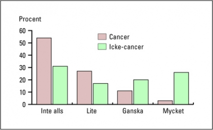 En uppdelning av patienter med malign respektive icke-malign sjukdom som hade pågående behandling med en stark opioid visade att hos 14 procent av patienterna i den första gruppen upplevde läkarna ganska eller mycket stora svårigheter att åstadkomma en bra smärtlindring. Motsvarande siffra för patienter med icke-malign sjukdom var 46 procent, se Figur 1.