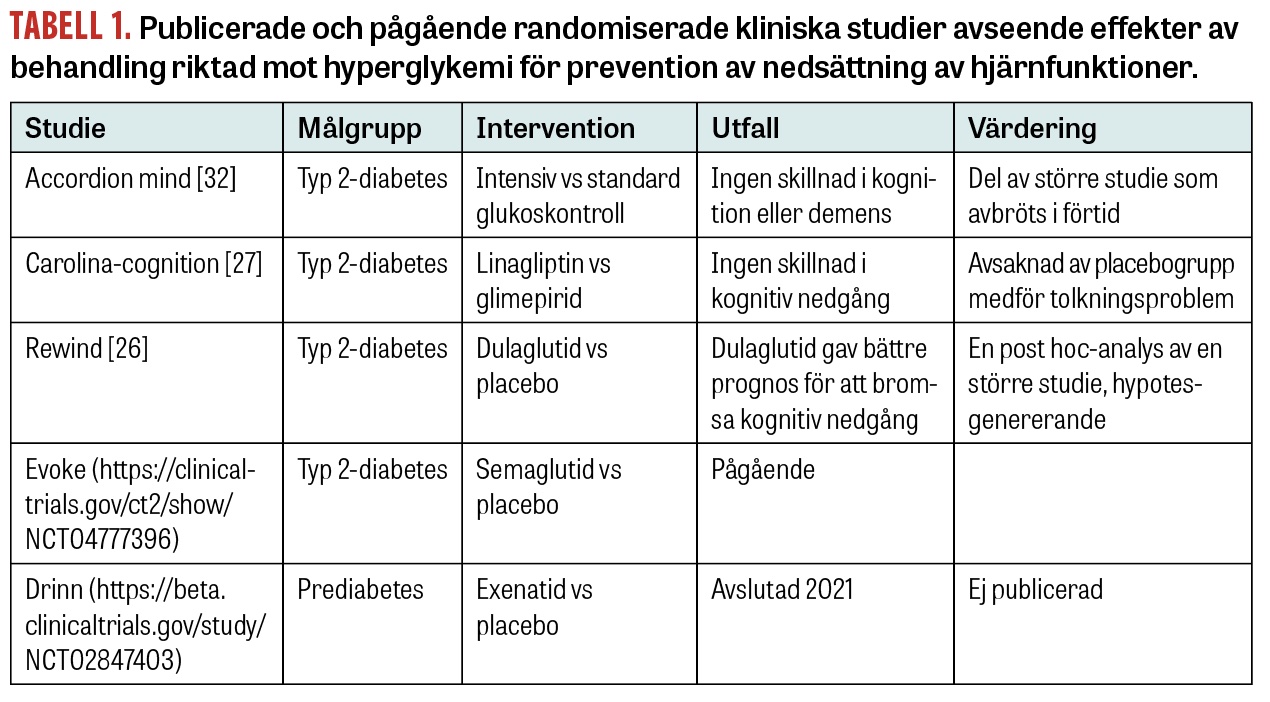 Ett antal kliniska prövningar med olika antidiabetiska läkemedel mot kognitiv nedsättning hos individer med eller utan diabetes pågår, enligt Clinicaltrials.gov (Tabell 1).