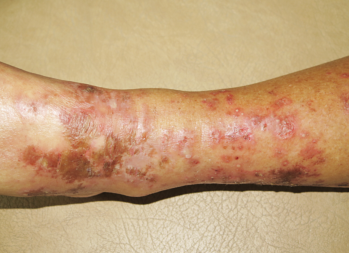 En tidigare frisk 51-årig man med 2 års anamnes på ett atypiskt, migrerande, rodnat och sårigt utslag på underben, underliv, skrotum, perianalt, vid näsan och runt ögonen. Tidigare övervikt (115 kilo); sedan 2 år 60 kilos viktnedgång, till en början frivilligt.