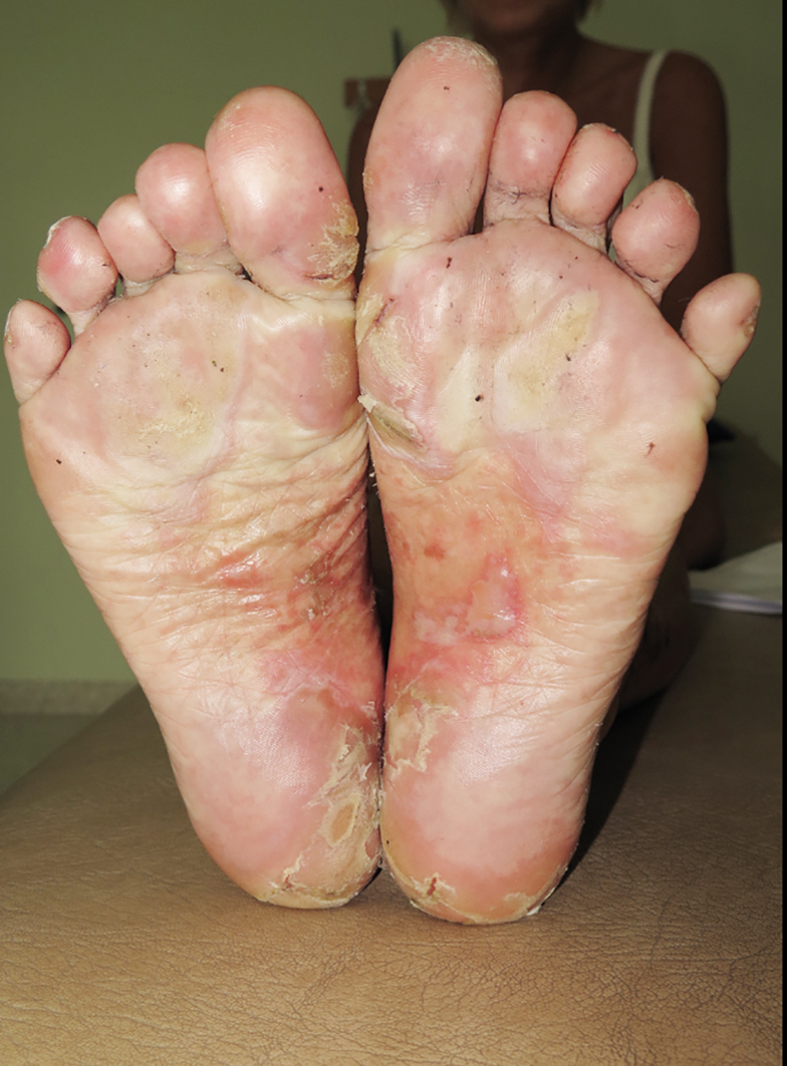 En tidigare frisk 55 år gammal kvinna som sökte hudkliniken för besvärliga fluktuerande hudutslag framför allt på händer och i underliv sedan 2 år tillbaka. Utslaget var hyperkeratotiskt med ömmande fissurer i händer och sårig hud runt anklar och i ljumskar och axiller. Via hudläkare hade hon fått behandling med potenta steroider, antibiotika och UV-ljus utan märkbar effekt. Viktnedgång 6 kilo. Hudbiopsi eller blodprov var inte tagna.
