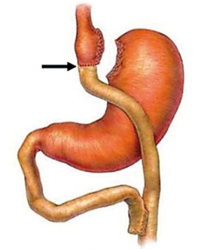 På grund av sjuklig fetma (vikt 151 kg, längd 175 cm, BMI 49,3) genomgick en i övrigt frisk kvinna vid 38 års ålder gastrisk bypass-operation (Figur 1). Postoperativt mådde patienten väl och gick ner till sin idealvi kt (69 kg, BMI 22,5). Två år efter operationen utvecklade hon en järnbristanemi som var refraktär för oral järnsubstitution, och hon fick därför upprepade järninfusioner. Under året som följde tillstötte alltför tidig mättnadskänsla och kräkningar.
