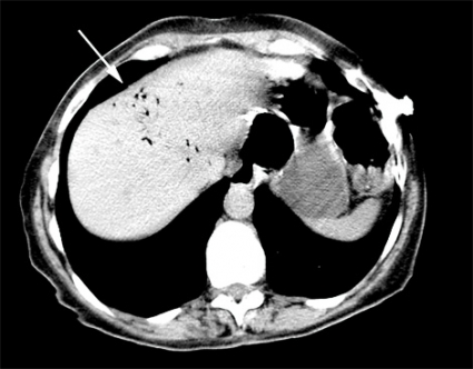 Patienten hade en grymtande spontanandning, vilken förbättrades genom extension i nacken. Patienten låg i vänster sidoläge, tippades i Trendelenburgläge och fick 10 liter syrgas på mask. I enlighet med våra rutiner vid plötslig medvetslöshet utlöstes hjärtlarm, och kardiolog och intensivvårdsteam anlände. Datortomografi (DT) av skallen genomföres under frågeställningen blödning, av torax under frågeställningen aspiration och av buken under frågeställningen fri gas. I det preliminära röntgenutlåtandet sågs rikligt med gas i tarmlumen och även intrahepatisk gas, sannolikt belägen i gallvägarna (Figur 2). Ingen cerebral infarkt eller blödning noterades. Patienten fördes till neurointensivvårdsavdelning och undersöktes av neurolog, som primärt misstänkte status epilepticus, men akut elektroencefalografi visade ingen epileptisk aktivitet.