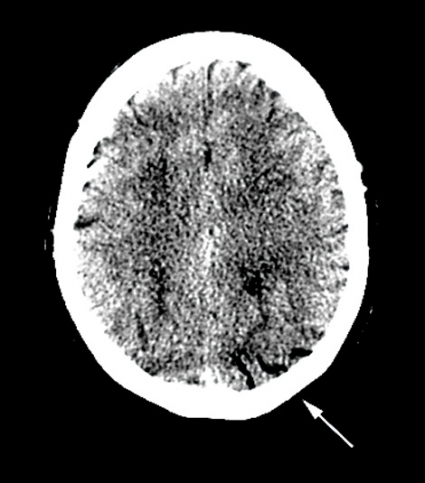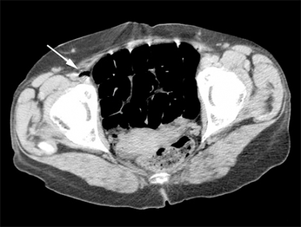 Vid litteratursökning senare samma dag återfanns ett mycket snarlikt fall av cerebral luftembolisering [1]. DT-undersökningarna granskades på nytt. Som tidigare nämnts fanns luft intrahepatiskt, men den här gången noterades luft även i vena femoralis på höger sida (Figur 2) samt i mindre kärl i glutealregionen på höger sida och i båda sidors ovarikakärl. Misstanke fanns även om luft i mesenterialkärlen. På DT av skallen återfanns intrakraniellt belägen luft i flera kärl, främst parietooccipitalt på vänster sida (Figur 3) men även högt frontalt bilateralt.
