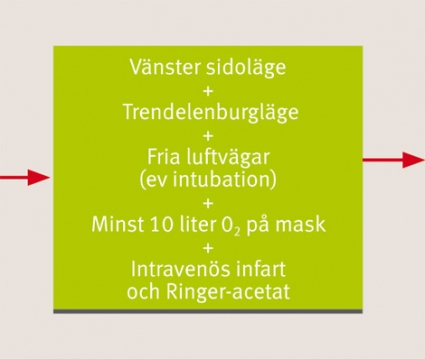 Om patienten får akuta neurologiska symtom under endoskopi och ligger i vänster sidoläge kan det teoretiskt vara en fördel att ha kvar patienten i detta läge, då gas flyttas mot apex, bort från trikuspidalklaffarna [5]. Då luft i blod söker sig uppåt ska patienten tippas i Trendelenburgläge, vilket minskar risken för cerebralt lufttillträde [6]. Tillkalla narkosläkare skyndsamt.
