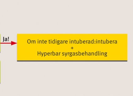 Patienten intuberades, ventilerades med 100 procent syre och fördes till Rigshospitalet i Köpenhamn för hyperbar oxygenbehandling. Under transporten blev patienten cirkulatoriskt instabil, vilket krävde en hel del vätska och initialt också inotropt stöd. De danska kollegorna initierade behandling för att täcka eventuell sepsis.