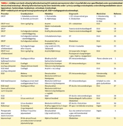 Cerebral gasembolisering vid gastrointestinal endoskopi beskrevs första gången år 1988 och drabbade en 4 månader gammal flicka som genomgått Kasais procedur (hepatoportoenterostomi). Flickan dog och obduktionen bekräftade diagnosen [9]. Sedan dess har tillståndet beskrivits under endoskopi av patienter med olika underliggande sjukdomar (Tabell I), dock inte som ovan efter överviktskirurgi.