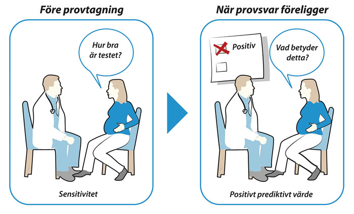 Figur 3. Illustration av de begrepp som definierar ett sannolikhetstest. Inför ett fostermedicinskt test frågar den gravida kvinnan hur bra metoden detekterar t ex trisomi 21 hos fostret. Läkaren eller barnmorskan svarar ofta med att ange sensitiviteten: ca 90 procent för KUB och >99 procent för NIPT [1]. Om testet är positivt blir kvinnans nästa fråga vad det innebär. Genom det positiva prediktiva värdet får kvinnan en uppfattning om hur sannolikt det är att testresultatet överensstämmer med verkligheten. Det positiva prediktiva värdet i en population med genomsnittlig sannolikhet för trisomi 21 är för KUB 3,4 procent och för NIPT 81 procent [12]. Positivt KUB- eller NIPT-test måste således alltid följas av ett invasivt test för att säkert diagnostisera kromosomavvikelse.