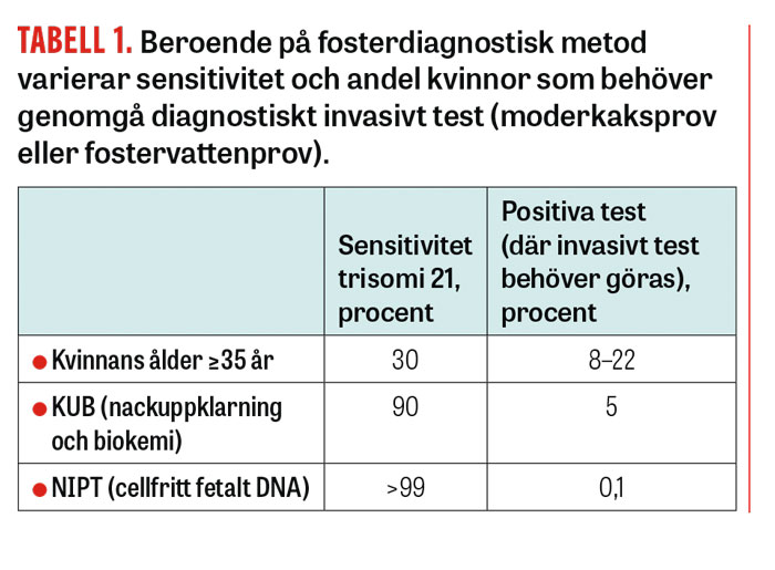 NIPT kan utföras från graviditetsvecka 9, vilket är tidigare än KUB [11]. Sensitivitet för trisomi 21 är drygt 99 procent, och andelen falskt positiva test är långt mindre (<0,1 procent) än vid KUB (5 procent) och jämfört med att använda åldersgränsen 35 år som indikation för invasivt test (8–22 procent) (Tabell 1) [1, 7, 12].