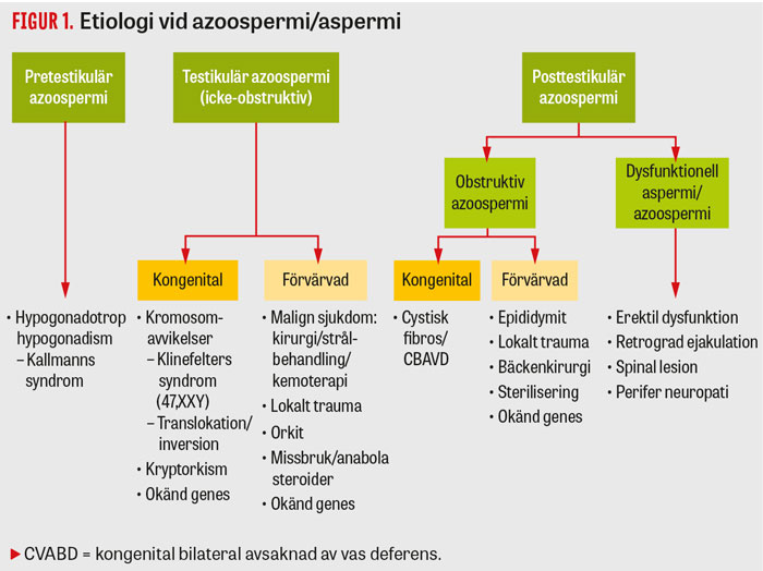Azoospermi definieras som frånvaro av spermier i ejakulatet vid åtminstone två spermaprovsanalyser och förekommer hos 8 procent av ofruktsamma män, vilket motsvarar 1 procent av den manliga befolkningen. Det finns tre huvudgrupper av azoospermi beroende på var defekten finns: pretestikulär, testikulär och posttestikulär azoospermi. Posttestikulär azoospermi uppdelas vidare i en obstruktiv grupp (hinder i utförsgångar) och en dysfunktionell grupp (beroende på ejakulationsstörning eller retrograd ejakulation) (Figur 1).
