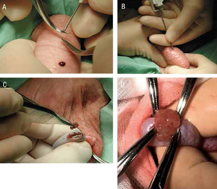 Figur 2. Kirurgiska metoder för spermieutvinning: A) multipla testikulära nålaspirationer, B) perkutan testikelbiopsi, C) öppen testikelbiopsi, D) mikro-TESE.