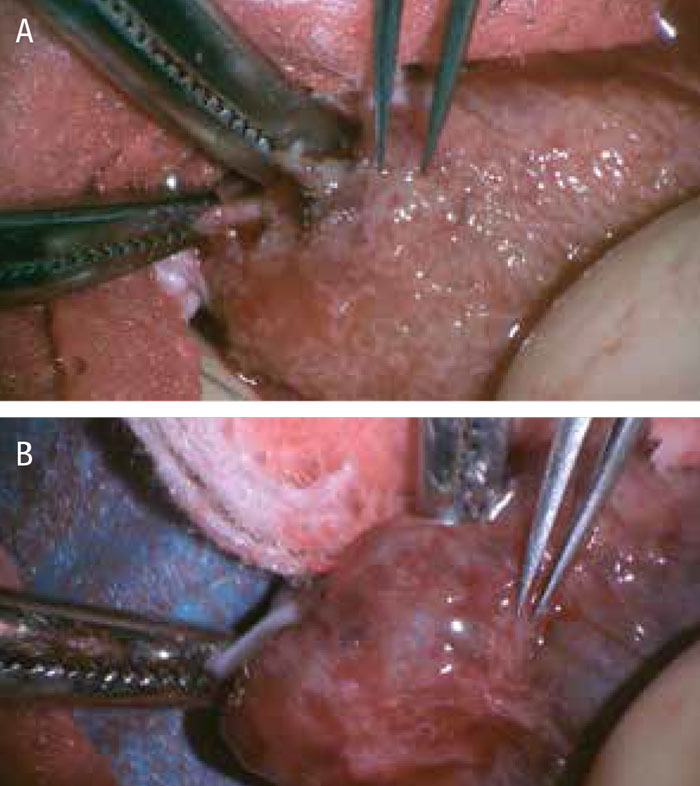 Figur 3. Testikelparenkym under peroperativ mikroskopering: A) fina testikulära tubuli, B) atrofi med avsaknad av tubuli.