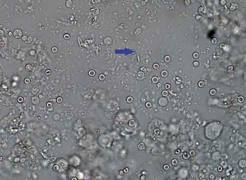 Figur 4. Slutgranskning görs i mikroskop. Bilden visar enstaka spermier i preparerat material.