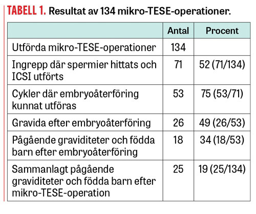 Mikro-TESE infördes i november 2013 som kompletterande operationsmetod på Livio Fertilitetscentrum, Göteborg, för män med icke-obstruktiv azoospermi. I oktober 2018 hade 134 operationer genomförts på kliniken. Resultaten (Tabell 1) är uppmuntrande. Patientparen har remitterats från olika landsting via vårdavtal eller sökt privat. I majoriteten av fallen hade männen tidigare genomgått ett testikulärt ingrepp (TESA/perkutan biopsi/konventionell TESE) utan påvisbar spermieförekomst men inte velat ge upp hoppet om att bli biologiska fäder.