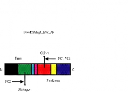 GLP-1 beskrevs 1982. Hormonet är en produkt av proglukagon i L-cellerna i tarmen [8]. Proglukagon uttrycks både i tarmens L-celler och i pankreasöarnas alfaceller men processas olika i dessa celler. Sålunda är det GLP-1 som är produkten av proglukagon i tarmen, medan det är glukagon som är produkten i pankreasöarna [9]. Denna skillnad beror på väv-nadsspecifikt uttryck av en enzymfamilj kallad prokonvertas (PC). PC1 och PC3 uttrycks i L-cellerna i tarmen, medan PC2 uttrycks i alfacellerna i pankreasöarna. Under inverkan av dessa prokonvertas spjälkas proglukagon till sina respektive slutprodukter. Detta visas schematiskt i Figur 1. GLP-1 är en peptid med 30 aminosyror. Hälften av dessa är identiska med sekvensen i glukagon. Härav har GLP-1 fått sitt namn: glukagonlik peptid.