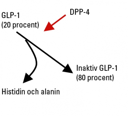 Peptider med aminosyran alanin i position 2 räknat från den N-terminala änden (som GLP-1) kan klyvas av DPP-4 genom att de två N-terminala aminosyrorna spjälkas från. För GLP-1:s del innebär det en inaktivering, eftersom den kvarvarande delen av GLP-1 är inaktiv [41]. DPP-4 är mycket potent, vilket medför att halveringstiden för GLP-1 är 2 minuter. Detta medför också att under normala betingelser är aktiv GLP-1 endast cirka 20 procent av den totala plasmapoolen av GLP-1. Initialt visades detta för människa i studier av Deacon och medarbetare 1995 [42]. I en översiktsartikel från 1998 utvecklades betydelsen av detta för diabetesbehandling med GLP-1 [43].