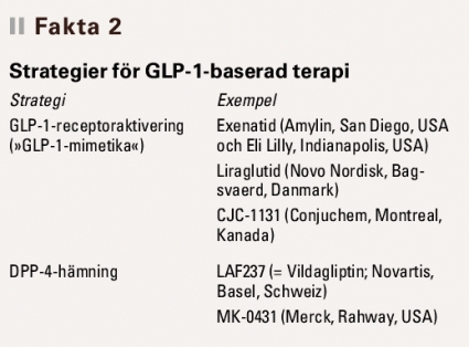 För att använda den potentiellt mycket framgångsrika GLP-1-baserade terapin i praktiken har två strategier utvecklats, vilka undanröjer den snabba nedbrytningen med DPP-4 (Fakta 2).
