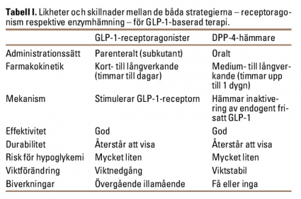 Båda huvudstrategierna av GLP-1-baserad terapi har således visats ha god antidiabetisk effekt även efter långtidsbehandling. Det finns likheter och skillnader mellan dessa båda strategier, vilket framgår av Tabell I. Vilken strategi som kommer att bli mest användbar får framtiden utvisa. Den viktigaste faktorn för val av strategi blir den effektivitet som strategierna kan ge på lång sikt.