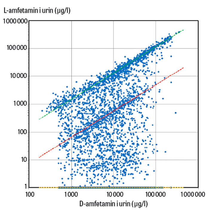 Resultat från kiral analys i urinprov vid Karolinska universitetslaboratoriet under 2013–2019 visade att den totala amfetaminkoncentrationen i 6 683 prov utan mätbart L-amfetamin var i medeltal 9 522 µg/l (medianvärde 5 364 µg/l). Spridningen var dock stor (2,5:e–97,5:e percentilen: 665–41 895 µg/l), och i 7 procent av fallen understeg koncentrationen 1 000 µg/l. Koncentrationen beror på flera faktorer, som läkemedelsdos, individuella skillnader i utsöndringshastighet, urinprovets utspädning [19] och inte minst när provet togs i förhållande till senaste dos (Elvanse intas vanligen en gång per dag på morgonen, Attentin en till två gånger dagligen). I 912 prov med en L/D-kvot över 0,75, vilket indikerar huvudsakligen illegalt amfetaminintag, var totalkoncentrationen betydligt högre, i medeltal 68 074 µg/l (medianvärde 24 076 µg/l), och endast 0,9 procent hade en koncentration under 1 000 µg/l. Eftersom amfetaminkoncentration i allmänhet är mycket högre vid illegalt intag underlättas möjligheten att upptäcka sidointag under ADHD-behandling genom kiral analys. I prov med låg amfetaminkoncentration och i utspädda urinprov krävs dock en känslig analysmetod [20].