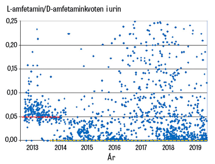 Figur 3. Kvoten mellan enantiomererna L-amfetamin och D-amfetamin i 7 742 urinprov med en L/D-kvot under 0,25 som analyserades vid Karolinska universitetslaboratoriet 2013–2019. Av resultaten framgår en ansamling av mätvärden under 2013–2014 med en L/D-kvot runt 0,05 (röd streckad linje), vilket kan hänföras till intag av Metamina, ett tidigare godkänt D-amfetaminläkemedel (numera licenspreparat) som även innehåller ca 5 procent L-amfetamin. Från 2014–2015 ersattes Metamina med Elvanse och Attentin, som baseras på enbart D-amfetamin, vilket framgår av att L-amfetamin saknas i många prov (orange streckad linje). Därutöver finns många resultat som indikerar ett större eller mindre sidointag av illegalt amfetamin.
