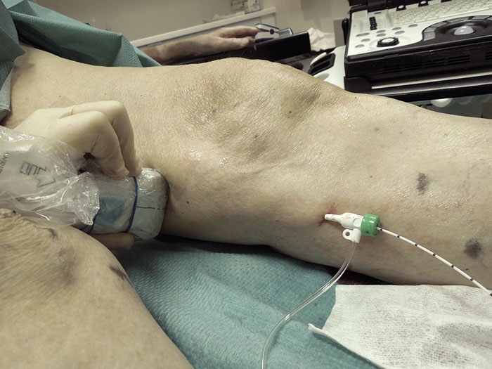 Figur 3. Under ultraljudskontroll injiceras det skleroserande skummet direkt in i venen.
