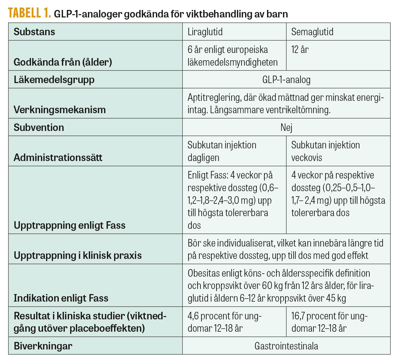 Glukagonlik peptid 1 (GLP-1)-analoger används för att behandla både typ 2-diabetes och obesitas, dock i olika doser och med olika kommersiella beteckningar. Liraglutid är godkänt av europeiska läkemedelsmyndigheten för viktkontroll från 6 års ålder och semaglutid är godkänt för viktkontroll från 12 års ålder efter att ha visat god effekt och säkerhet i kliniska studier på ungdomar 12–18 år (Tabell 1) [13-15]. Det nyare preparatet semaglutid har fördelen att injektionen tas en gång i veckan i stället för varje dag. Liraglutid och semaglutid har inte jämförts i samma studie. Resultaten från separata studier visar en större effekt av semaglutid. Läkemedelsutvecklingen inom området är intensiv, och vi kan förvänta oss fler behandlingsalternativ framöver också för barn.